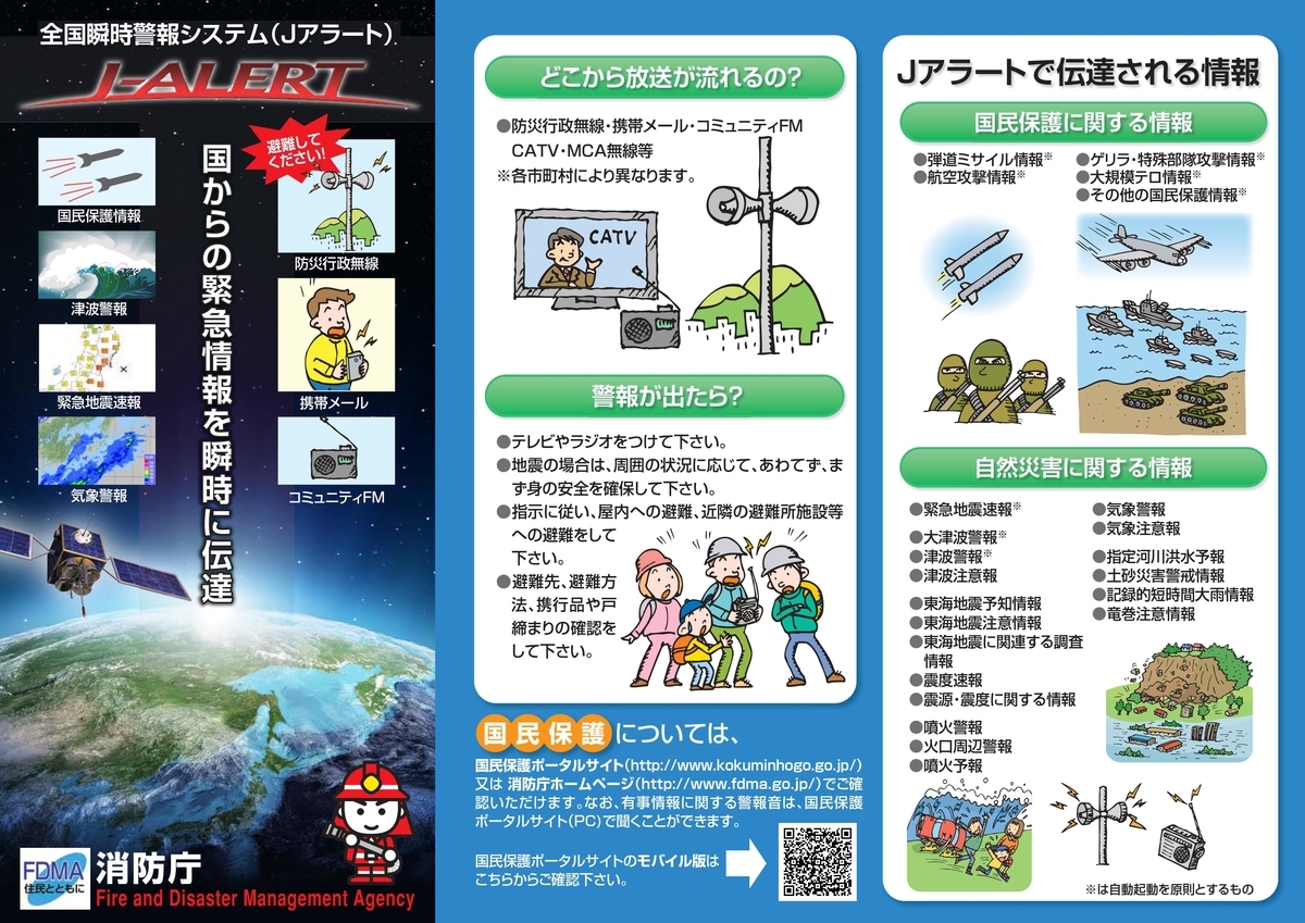 ゲリラ攻撃情報なんてのもあるようです。警報音はブー⤴︎⤵︎「ゲリラ攻撃情報。ゲリラ攻撃情報。当地域にゲリラ攻撃の可能性があります。屋内に避難し、テレビ・ラジオをつけてください。」なんだそうです。現実味がさっぱりないので、へぇー、へぇー、へぇーとボタンを連打してしまいたくなりますが、知識として知っておいて損はないかと思います。