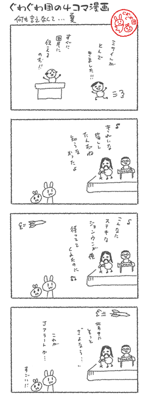 もはや誰に向けて描いているのかさっぱりわからないのですが、とりあえずネタを思いついて日中ニヨニヨしていたのは秘密です。こんなの、本当にミサイルが着弾してたら絶対に描けないですから、返す返すも何もなくてよかったです。