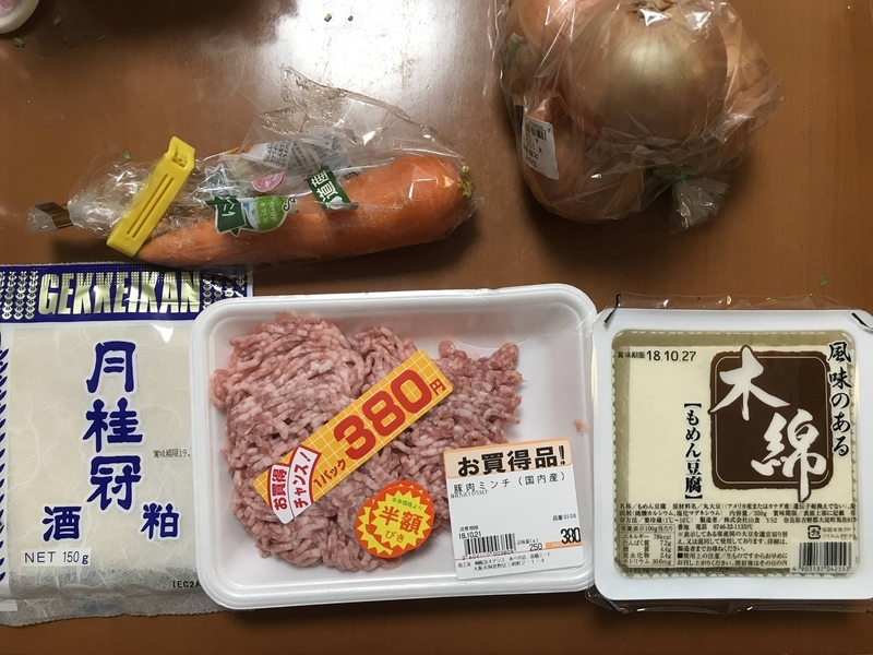 豚汁の材料です。真ん中にあるのが「お買得チャンス!1パック380円」と書かれた豚肉ミンチです。そして「半額」シールが貼られているので、実質190円となります。