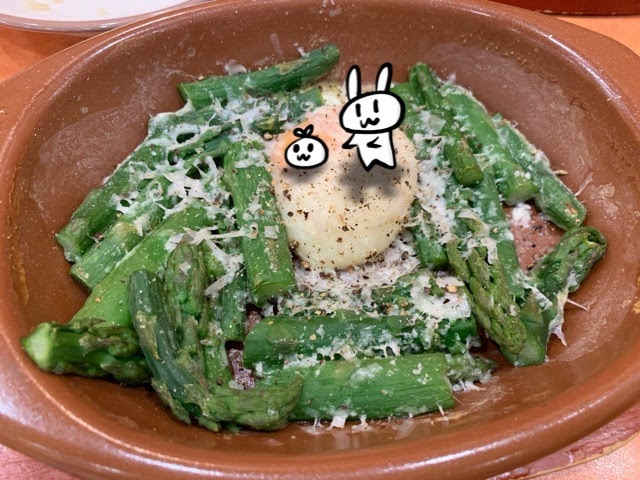 さて、サイゼリヤのアスパラガスのオーブン焼きです。アスパラガスをオーブンで焼いただけですが、とても美味しかったです。どっちかというと、ワインを飲む時に合うと思います。合掌。